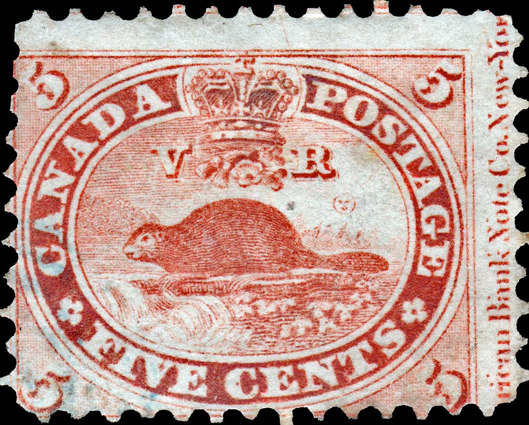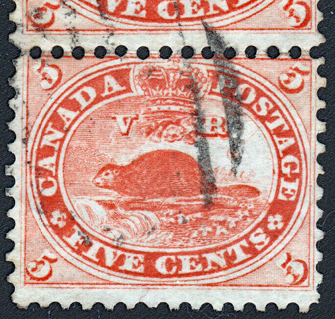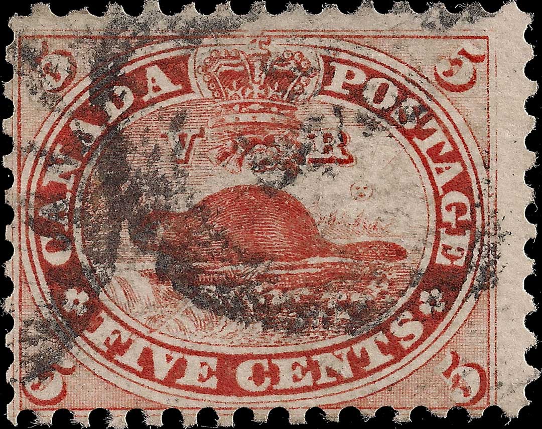 | *38 | Scott #15 Five Cents Re-entry Plate Position #38 State 8-9 R25 Here we see an interesting comparison between different states of the same plate position. Among the many markings visible, note the various dots of colour in ‘IVE CENT’ in the first two stamps. Also note the small vertical dash in the bottom of the ‘D’ which is key in the identification of this position. Note the angled line in the lower margin below the ‘V’ and another in the white border above the first ‘A’ of CANADA. This is an excellent example of how drastically the stamp changed from one state to the next, and why it can be so very tricky making an idenification. Both of the two stamps are Courtesy of Earl Noss.
