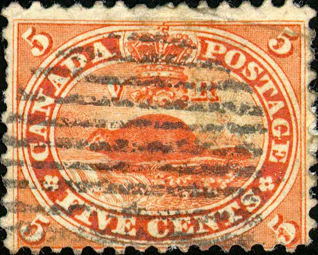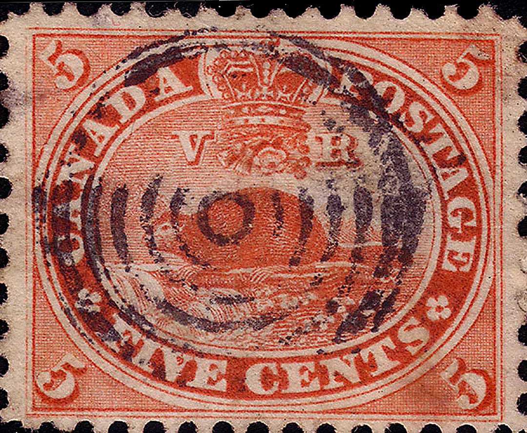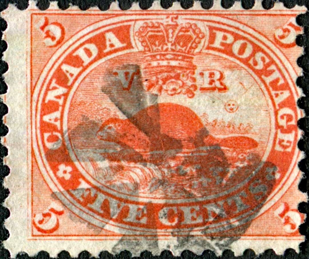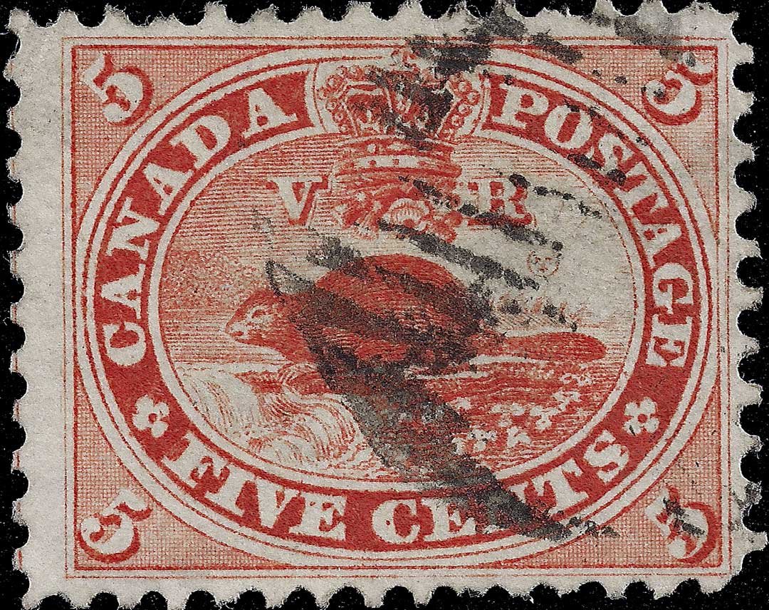 | *38 | Scott #15 Five Cents Re-entry Plate Position #38 State 8-9 R25 Here we see an interesting comparison between different states of the same plate position. Among the many markings visible, note the various dots of colour in ‘IVE CENT’ in the first two stamps. Also note the small vertical dash in the bottom of the ‘D’ which is key in the identification of this position. Note the angled line in the lower margin below the ‘V’ and another in the white border above the first ‘A’ of CANADA. This is an excellent example of how drastically the stamp changed from one state to the next, and why it can be so very tricky making an idenification. Both of the two stamps are Courtesy of Earl Noss.